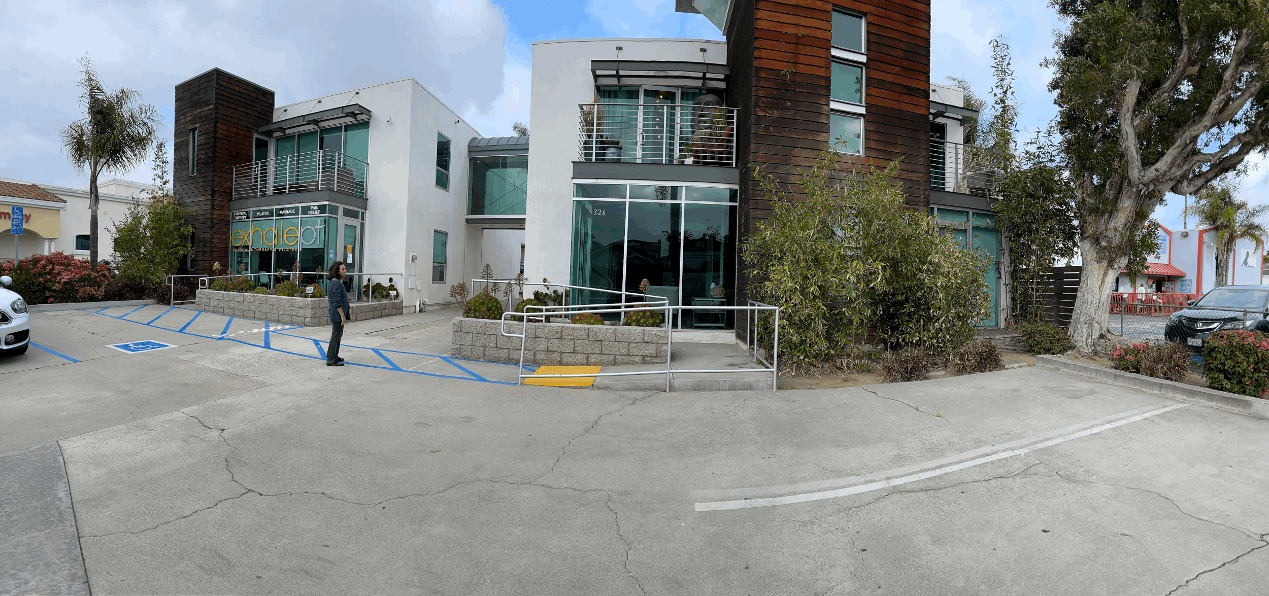 Entrance in the back parking lot, stairs to the right